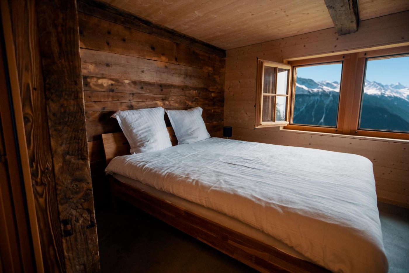 Chalet. Rustic-style chalet with a bedroom, a living area, and a balcony overlooking the mountains. Bathrobes and slippers are provided. The bathroom is reachable via an external staircase. ;